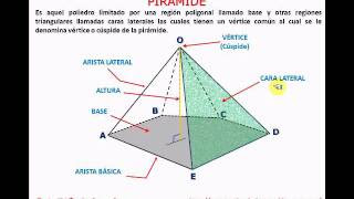 Hola, aqui les dejo mi nuevo vídeo que trata acerca de las partes de una piramide que son la base, caras, aristas, vertcies, cuspide y identifica los elementos de un prisma. Solo existen cinco poliedros regulares, los cuales son: